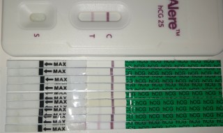 Sunday 13th: Faint positive, but I started to bleed. Bought a more expensive, supposedly more sensitive test. Line still as faint. Miscarriage? Fading out again?